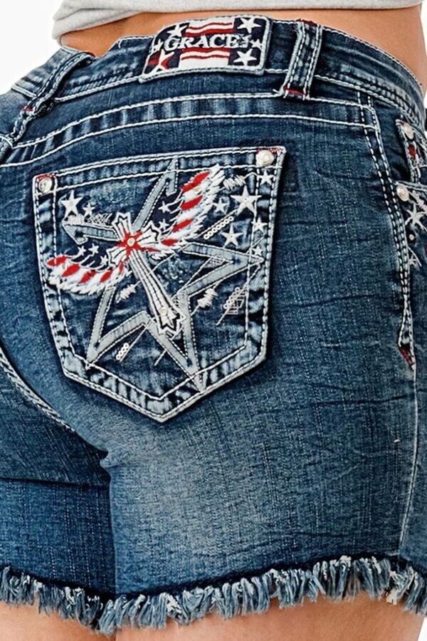 Show your patriotic spirit in style with the American Star Low Rise Denim Shorts from Grace in LA. Designed for the free-spirited woman who loves a mix of bold detail and effortless comfort, these shorts bring a touch of Americana to your everyday wardrobe.