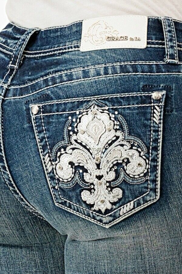 Crafted from high-quality stretch denim, they offer a flattering mid-rise fit that hugs your curves while providing all-day comfort. The signature Fleur De Lis embroidery on the back pockets is beautifully detailed with rhinestone embellishments and metallic accents, adding a touch of glamour to every step.