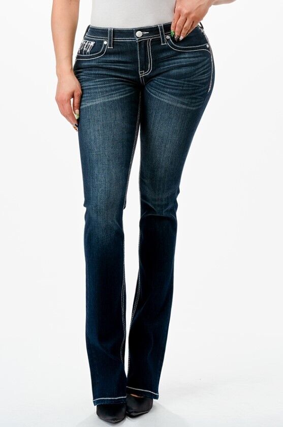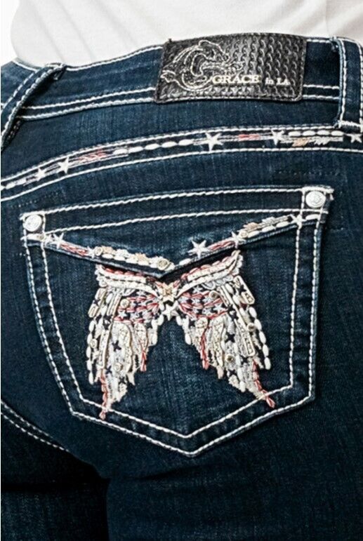 Crafted from premium stretch denim, they offer a flattering, body-hugging fit that moves with you while maintaining its shape. The signature wing embroidery on the faux flap back pockets is intricately detailed with rhinestones and metallic thread, creating a stunning design that catches the light with every step. Subtle fading and whiskering add dimension and a touch of vintage flair, while the bootcut leg elongates the silhouette for a timeless, flattering look.